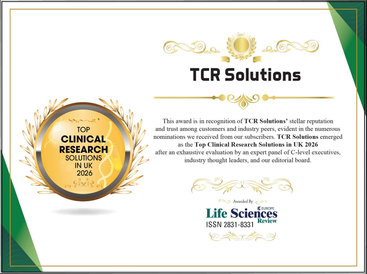 Dr Peter Maclennan, CEO of TCR Solutions, said: “We are delighted to be recognised by Life Sciences Review Europe as a Top Clinical Research Solution in the UK for 2026. This recognition reflects our commitment and the strength of the relationships we have built with clients and site partners. We remain focused on delivering practical, tailored support that helps sponsors run high-quality studies within increasingly complex research environments.”